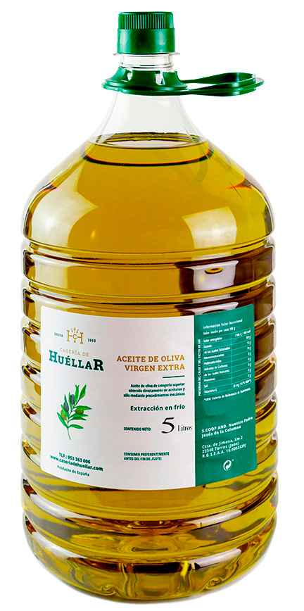 Aceite de oliva virgen extra en garrafa PET de 5 litros, la caja esta compuesta por 3 unidades